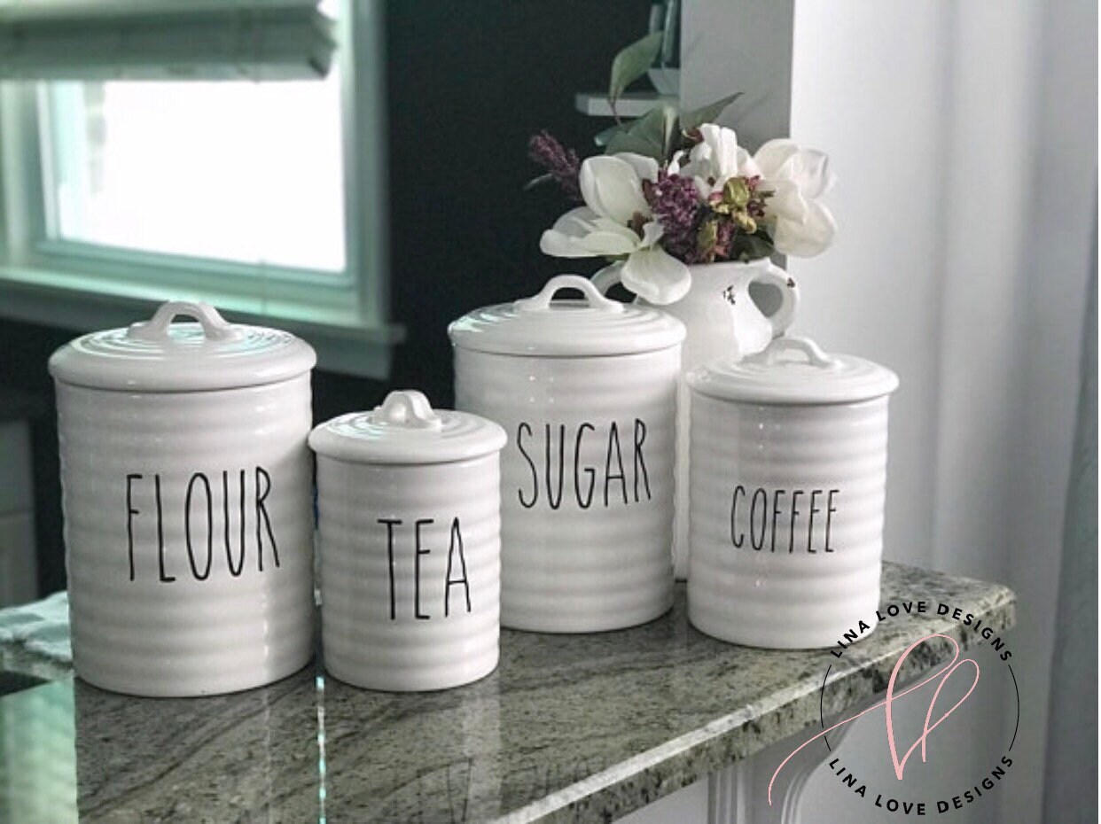 Web Rae Dunn CoffeeTeaFlourSugarMilkCream canister.